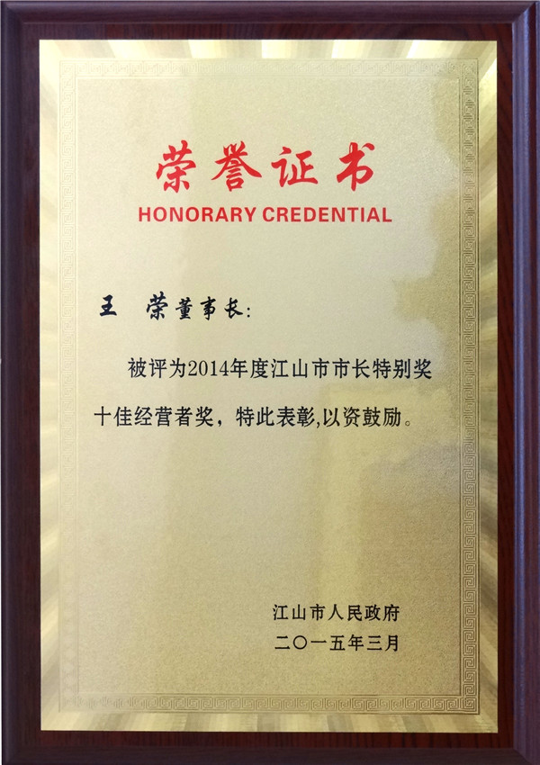 喜訊:王榮董事長被評為2014年度江山市市長特別獎十佳經(jīng)營者獎