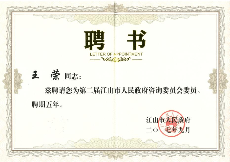 喜訊:我司董事長王榮受聘為江山市人民政府咨詢委員會委員
