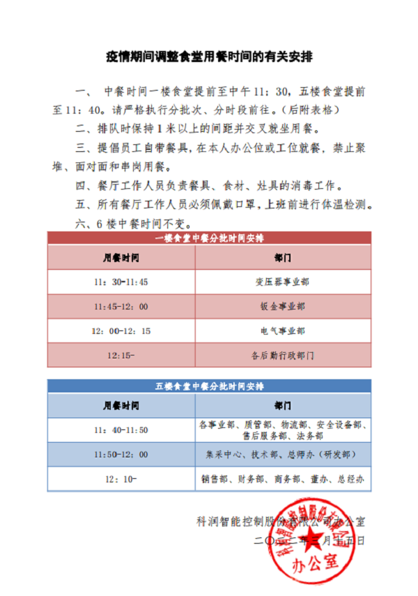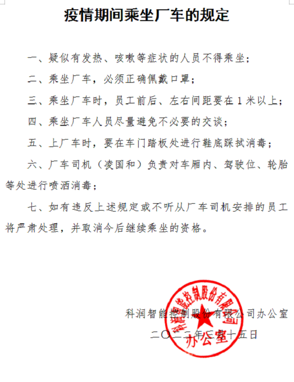 及時(shí)轉(zhuǎn)發(fā)衢州發(fā)布、江山發(fā)布等載體關(guān)于新型冠狀病毒防控常識(shí)、核酸檢測注意事項(xiàng)和最新疫情通報(bào)等,教育引導(dǎo)廣大員工以科學(xué)的態(tài)度認(rèn)識(shí)疫情,并發(fā)出告員工通知書,號(hào)召全體員工用實(shí)際行動(dòng),共同守護(hù)幸福家園,展現(xiàn)科潤智控全體員工的擔(dān)當(dāng)和力量。截止3月17日,公司全體員工已全部完成第一輪核酸檢測;對(duì)外來人員和車輛出入嚴(yán)格控制,要求正確佩戴口罩、掃碼、測溫、消毒、登記、查看48小時(shí)核酸報(bào)告;公司全域消毒;食堂錯(cuò)時(shí)就餐,排隊(duì)間距控制在一米等。